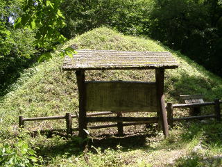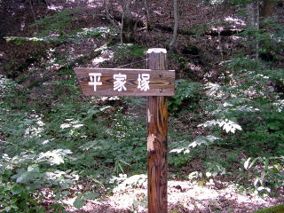 これが平家塚です。この塚に平家の落人たちが刀や鎧を埋めたとされています。 地元には「見れば目がくさる。」「さわれば手がくさる」という伝承が残っているそうです。昔、この塚を掘り起こそうとした者が雷のたたりにあったとも言われています。 確かに古墳のような小山は土を盛り上げて作られています。説明書きの右側に小さな祠があって、雰囲気をいっそう盛り上げています。まさに、歴史ミステリーの世界を感じました。 |