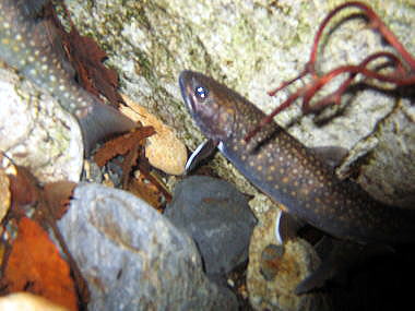 カメラを岩魚のいそうな場所にそっとセットして、カンでシャッターを切りました。運良く最初に撮影できたのはこの尻尾(^。^;)用心深いことで有名な岩魚ではありますが、この時期は種の保存という指命が第一!何度か撮影をくり返してやっと魚影をとらえることができました。 |